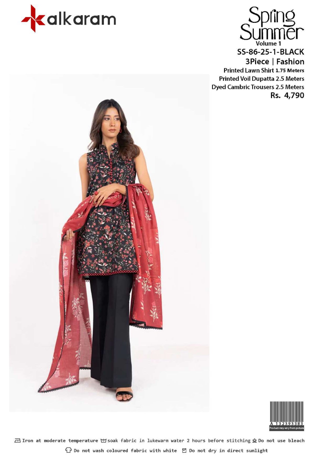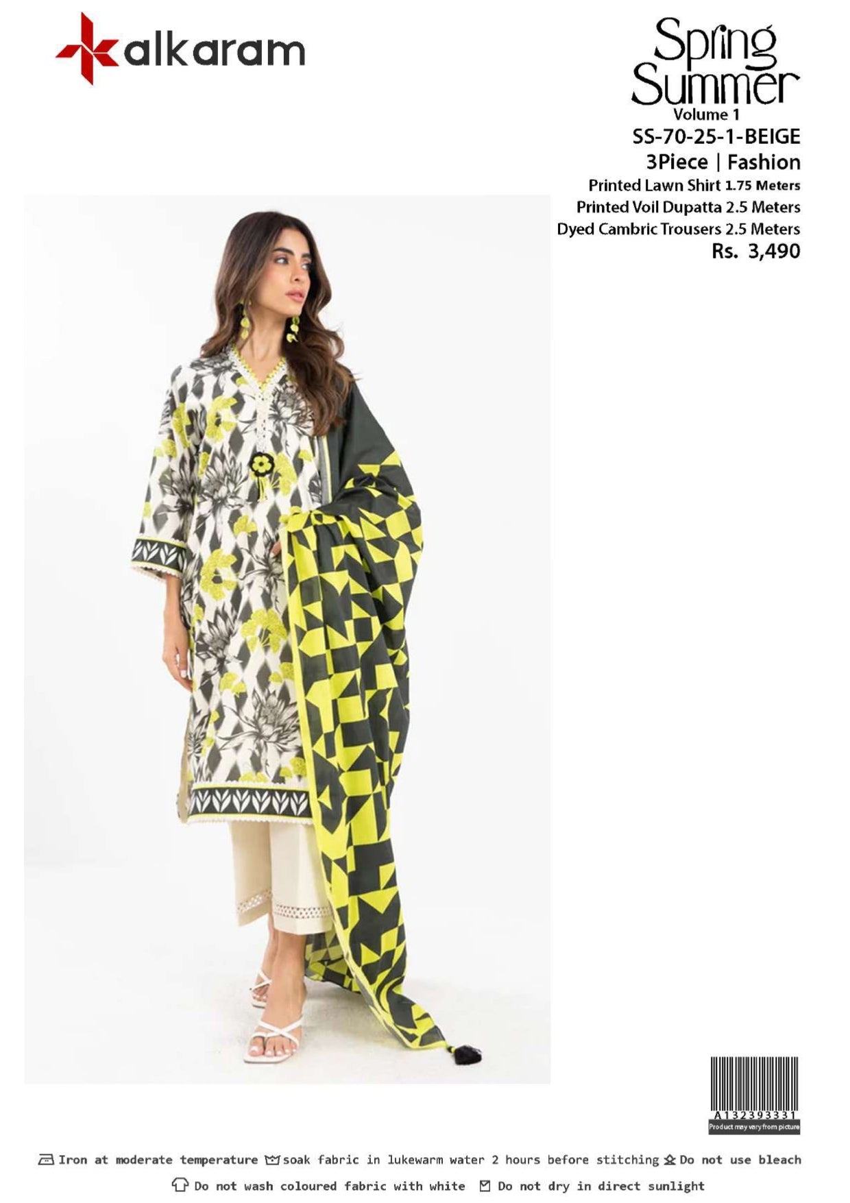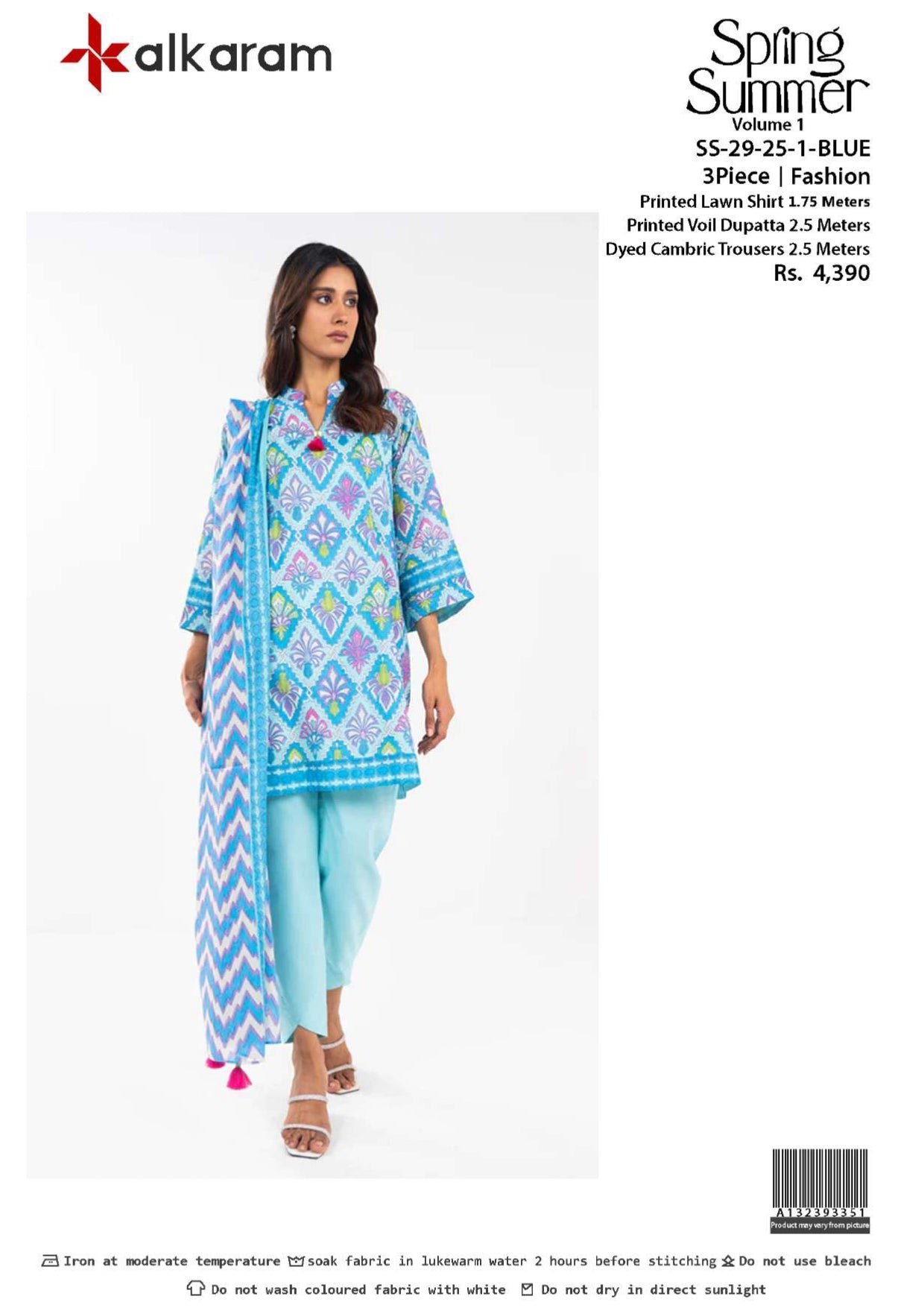Part of Al‑Karam’s Vol‑20 Spring/Summer lawn series, this unstitched fabric set features a three-piece ensemble—a printed lawn shirt, matching lawn dupatta, and dyed cambric trousers