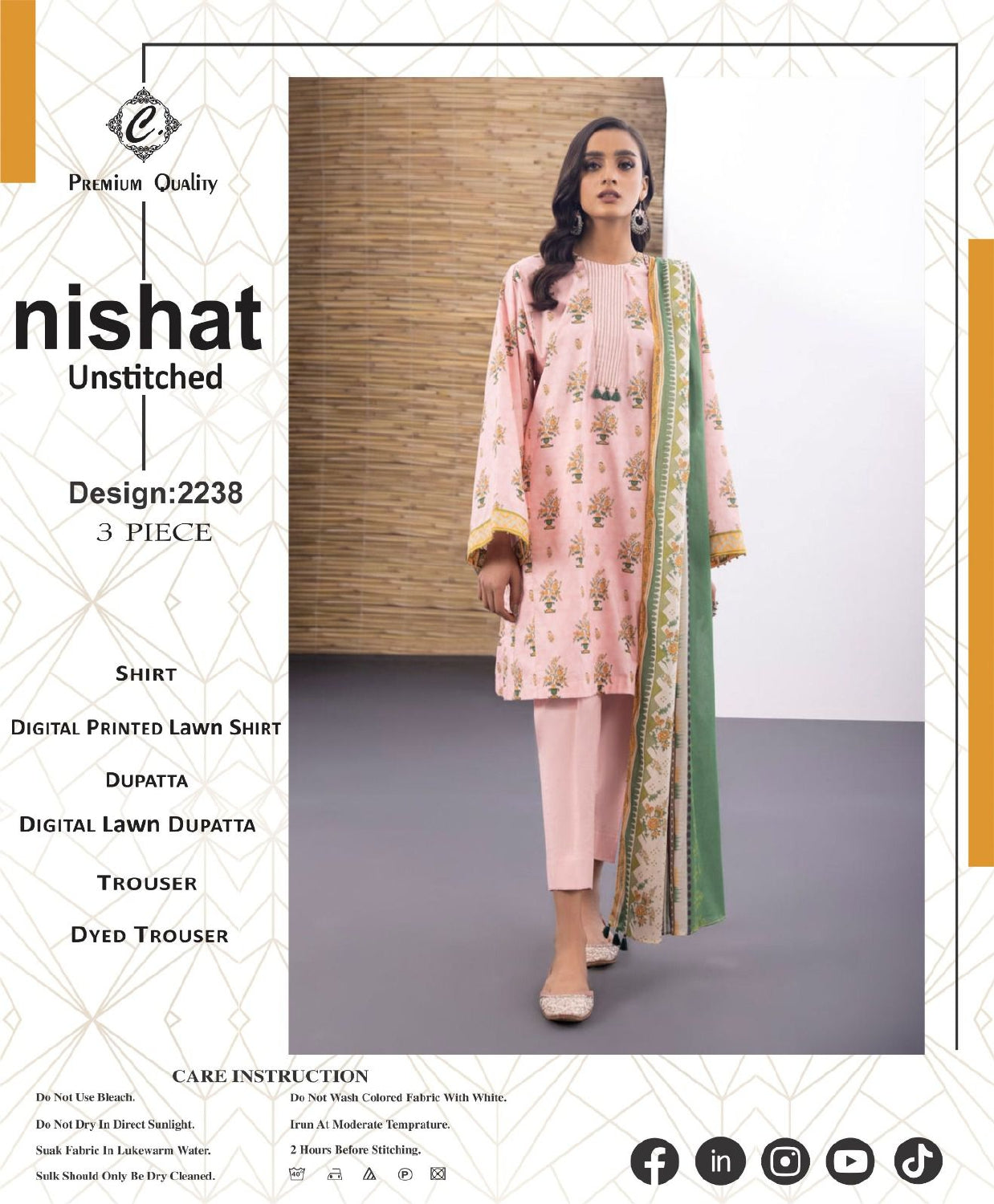 This piece from Nishat Luxury’s premium lawn series features a 3‑piece unstitched suit with: