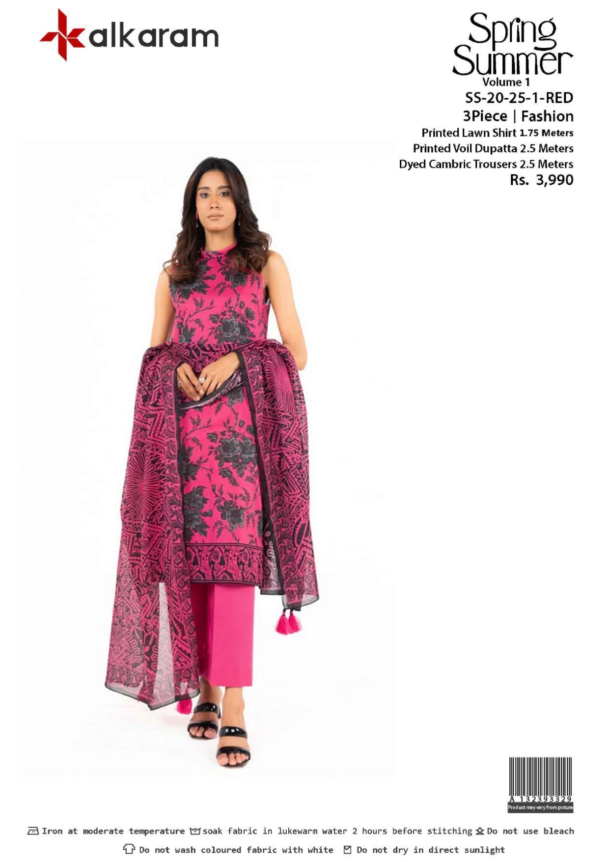 Part of Al‑Karam’s Vol‑20 Spring/Summer lawn series, this unstitched fabric set features a three-piece ensemble—a printed lawn shirt, matching lawn dupatta, and dyed cambric trousers